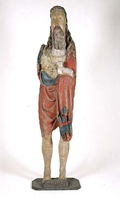 The third of the Fethard figures represents St. John Baptist bearing the Lamb of God. The statue is almost life-size; it is made of oak and the back is hollowed out. The right arm is missing, the Lamb is damaged, also the top of St. John’s head and the hair at the sides; the whole nose has been replaced, and the painting of the face is the mere daub of an amateur. The treatment of the anatomy with its flat chest and thick wide neck are almost certain signs of Irish work; but the hair technique of interlocked strands suggests an English influence. This technique often seen on English 15th Century sculpture is well illustrated on an alabaster figure from Selby Yorkshire. It is also clearly shown on a carved wood Madonna in York Museum. The folds of the cloak indicate late mediaeval craftsmanship.