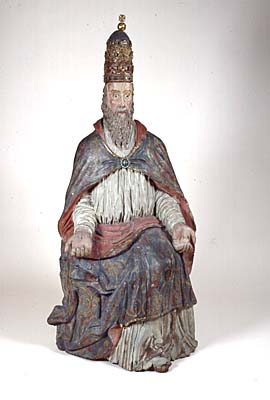 The second statue from Fethard represents God the Father. It is part of a Trinity Group, and is especially interesting because of local devotion to the Blessed Trinity in mediaeval Fethard. There, two churches were dedicated to the Trinity-the great square towered parish church which belonged to the Regular Canons of St. Augustine, and the Monastery of the Holy Trinity founded by the Friars of St. Augustine.